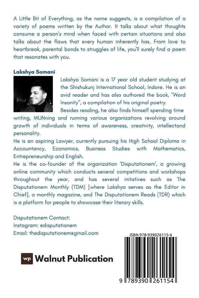 A Little Bit of Everything, as the name suggests is a compilation of a variety of poems written by the Author. It talks about what thoughts consume a person’s mind when faced with certain situations and also talks about the flaws that every human inherently has. From love to heartbreak, parental bonds to struggles of life, you’ll surely find a poem that resonates with you.