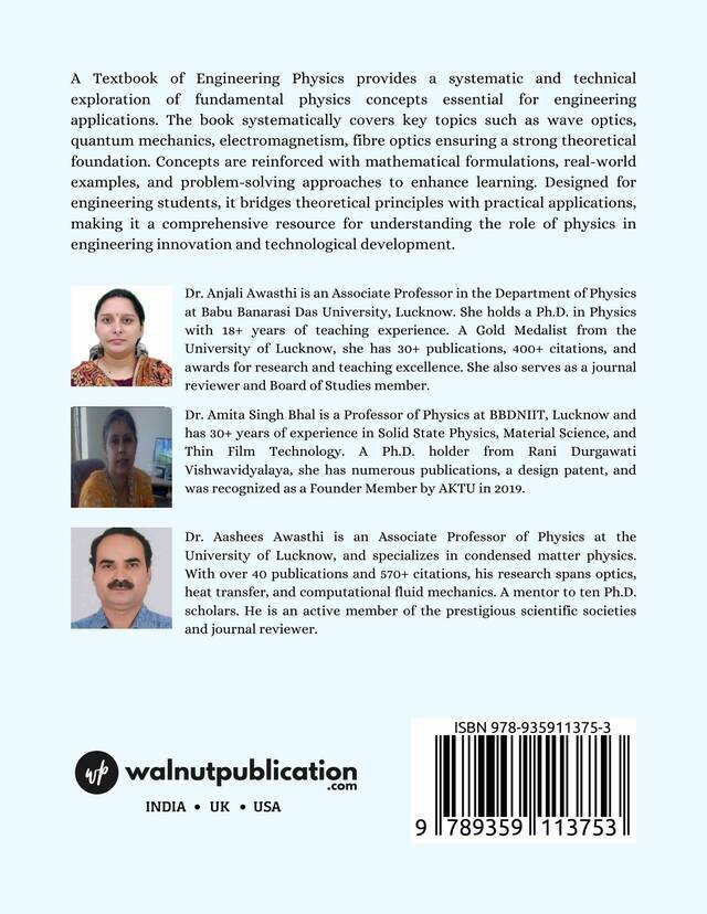 A Textbook of Engineering Physics provides a systematic and technical exploration of fundamental physics concepts essential for engineering applications. The book systematically covers key topics such as wave optics, quantum mechanics, electromagnetism, fibre optics ensuring a strong theoretical foundation. Concepts are reinforced with mathematical formulations, real-world examples, and problem-solving approaches to enhance learning. Designed for engineering students, it bridges theoretical principles with practical applications, making it a comprehensive resource for understanding the role of physics in engineering innovation and technological development.