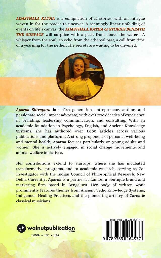 ADASTHALA KATHA is a compilation of 12 stories, with an intrigue woven in for the reader to uncover. A seemingly linear unfolding of events on life’s canvas, the ADASTHALA KATHA or STORIES BENEATH THE SURFACE will surprise with a peek from above the waters. A whisper from the soul, an echo from the ethereal past, a call from time or a yearning for the nether. The secrets are waiting to be unveiled.