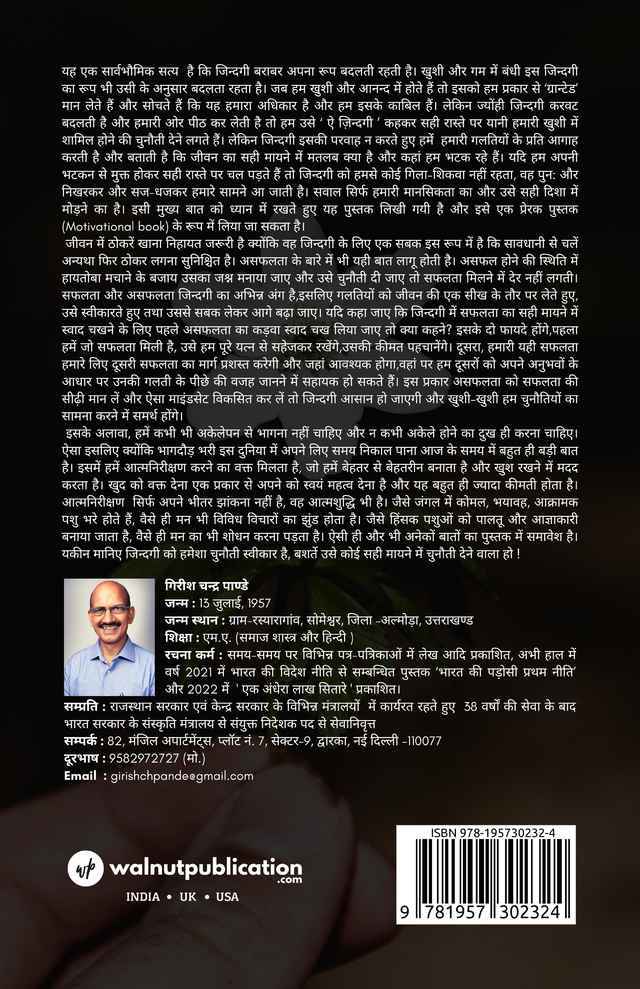 It is a universal truth that life constantly changes its form. The form of this life bound in happiness and sorrow also keeps changing accordingly. When we are in happiness and joy, we take it for granted and think that it is our right and we deserve it. But as soon as life turns around and turns its back on us, we challenge it to be on the right track, that is, join our happiness by saying ‘O Zindagi’. But life, regardless of this, warns us about our mistakes and tells us what is the real meaning of life and where we are wandering. If we get rid of our wandering and walk on the right path, then life does not hold any grudge against us, it comes in front of us again and again with a more beautiful and decorated look. The question is only of our mindset and to divert it in the right direction. Keeping this main thing in mind, this book has been written and it can be taken as a motivational book. It is very important to stumble in life because it is a lesson for life in the form that one should walk carefully otherwise stumble again is sure. The same thing applies about failure. In the event of failure, instead of creating a hue and cry, it should be celebrated and challenged, then it does not take long to get success. Success and failure are an integral part of life, so taking mistakes as a lesson of life, accepting them and taking lessons from them, move forward. If it is said that in order to truly taste success in life, one must first taste the bitter taste of failure, then what to say? It will have two advantages, first, we will keep the success we have achieved, we will keep it with full effort, we will recognize its value. Second, our own success will pave the way for our second success and where necessary, we can help others to know the reason behind their mistake on the basis of our experiences. In this way, consider failure as a stepping stone to success and develop such a mindset, then life will become easier and we will be able to face challenges happily. Furthermore, we should never run away from loneliness and never feel the pain of being alone. This is because in today’s world it is a big deal to find time for yourself. It gives us time to introspect, which makes us the best of the best and helps keep us happy. To give time to yourself is to give importance to yourself in a way and it is very precious. Introspection is not just looking within, it is also self-purification. Just as the forest is full of tender, fearful, aggressive animals, so the mind is also a swarm of diverse thoughts. Just as violent animals are made domesticated and obedient, so also the mind has to be purified. Many more such things are included in the book. Believe that life is a challenge to be accepted, provided there is someone to challenge it in the true sense!
