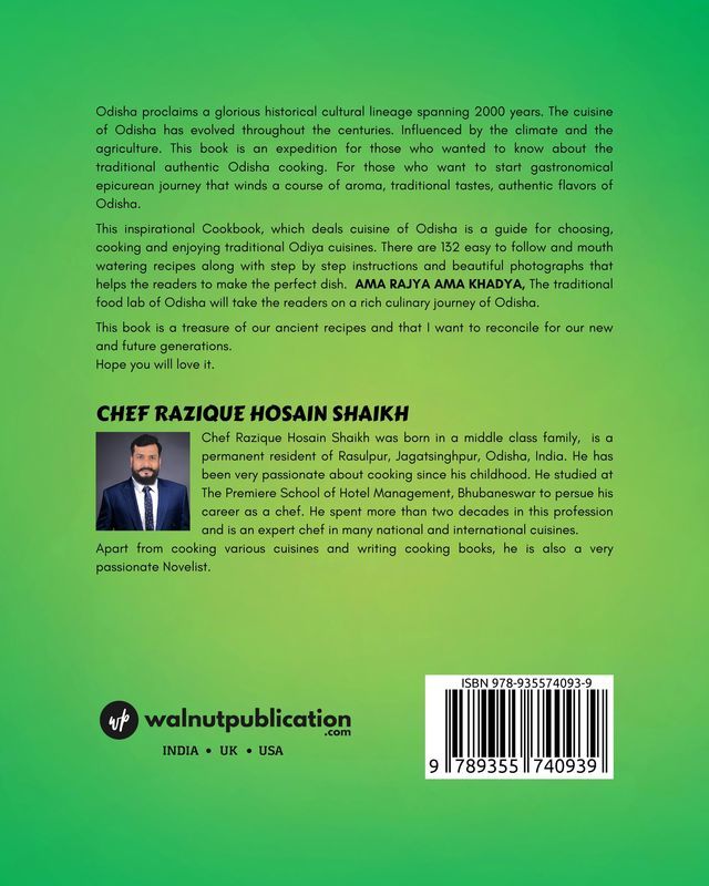 Odisha proclaims a glorious historical and cultural lineage spanning 2000 years. The cuisine of Odisha has evolved throughout the centuries influenced by the climate and agriculture. This book is an adventure for those interested in traditional authentic Odisha cooking. For those who want to start a gastronomical epicurean journey that winds a course through aromas, traditional tastes, and authentic flavours of Odisha. This inspirational cookbook, which deals with the cuisine of Odisha, is a guide for choosing, cooking, and enjoying traditional Odia cuisine. There are 150 easy-to-follow and mouth-watering recipes along with step-by-step instructions and beautiful photographs that help the readers to make the perfect dish. AMA RAJYA AMA KHADYA, the Odisha traditional food lab will take readers on a rich culinary journey through Odisha. This book is a treasure of our ancient recipes that I want to reconcile for our new and future generations.