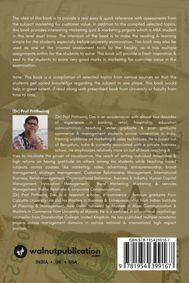 The idea of this book is to provide a real easy & quick reference with assessments from the subject marketing for customer value. This book may also be used as one of the internal assessment tools by the faculty, as it has multiple assignments within for the students to solve.