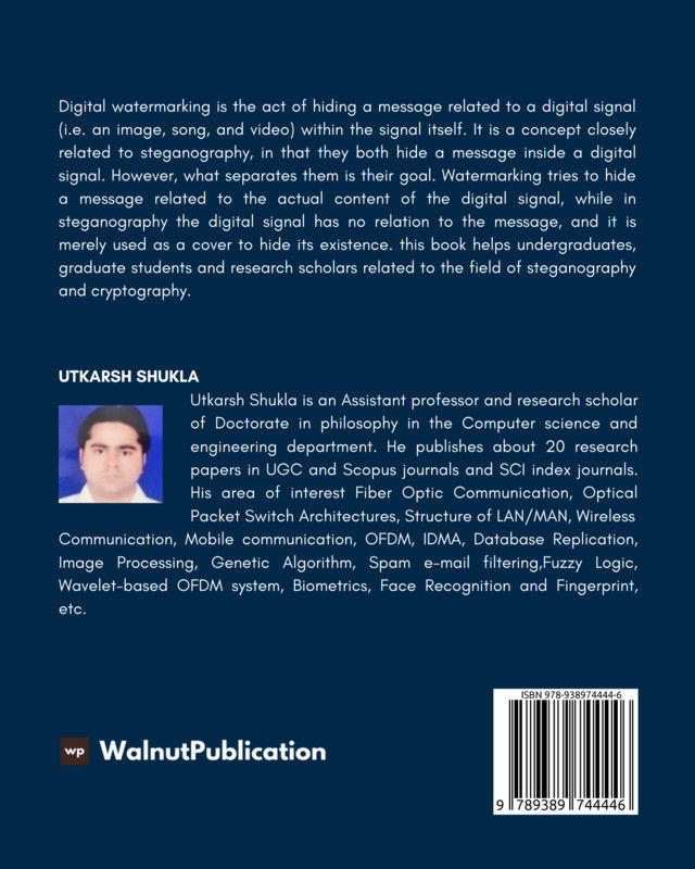 Digital watermarking is the act of hiding a message related to a digital signal (i.e. an image, song, and video) within the signal itself. It is a concept closely related to steganography, in that they both hide a message inside a digital signal. However, what separates them is their goal. Watermarking tries to hide a message related to the actual content of the digital signal, while in steganography the digital signal has no relation to the message, and it is merely used as a cover to hide its existence. this book helps undergraduates, graduate students and research scholars related to the field of steganography and cryptography.