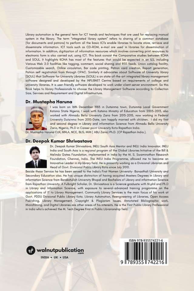 Library automation is the general term for ICT trends and techniques that are used for replacing manual system in the library. The term “integrated library system” refers to sharing of a common database (for documents and patrons) to perform all the basic ICTs enable libraries to locate store, retrieve and disseminate information. ICT tools such as CD-ROM, e-mail are used in libraries for dissemination of information. In addition, digitization of information resources which involves converting print resources to electronic form is also carried out, using ICT. This book consist the Comparative studies between KOHA and SOUL. It highlights KOHA has most of the features that would be expected in an ILS, including Various Web 2.0 facilities like tagging, comment, social sharing and RSS feeds. Union catalog facility, Customizable search, Online circulation, Bar code printing, Patron card creation, Report generation, Patron self registration from through OPAC. Similarly it advocates about Software of University library (SOUL) that Software for University Libraries (SOUL) is an state-of-the-art integrated library management software designed and developed by the INFLIBNET Centre based on requirements of college and university libraries. It is user-friendly software developed to work under client-server environment. So this Book helps to library Professionals to choose the Library Management Software according to Collection Size, Servises and Requirement and Digital Infrastructure.