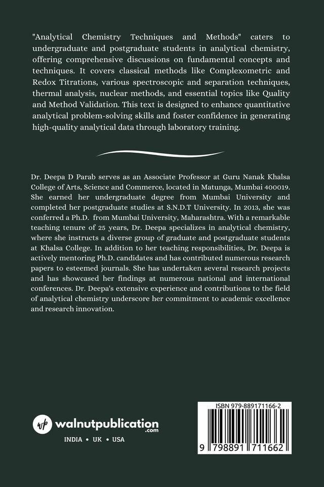 “Analytical Chemistry Techniques and Methods” is designed for both undergraduate and postgraduate students in analytical chemistry, providing thorough discussions on key concepts and techniques. The book explores classical methods, including complexometric and redox titrations, along with a variety of spectroscopic and separation techniques, thermal analysis, nuclear methods, and critical topics such as quality assurance and method validation.