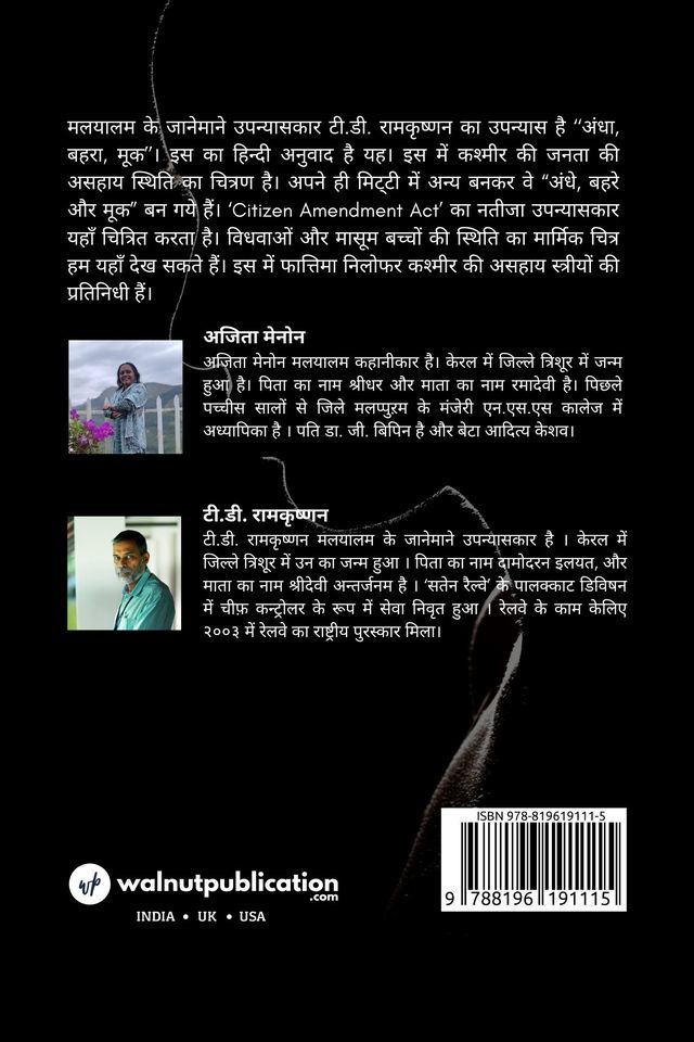 मलयालम के जानेमाने उपन्यासकार टी.डी. रामकृष्णन का उपन्यास है ‘‘अंधा, बहरा, मूक’’। इस का हिन्दी अनुवाद है यह। इस में कश्मीर की जनता की असहाय स्थिति का चित्रण है।