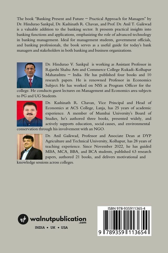 The book “Banking Present and Future – Practical Approach for Managers” by Dr. Hindurao Sankpal, Dr. Kashinath R. Chavan, and Prof. Dr. Anil T. Gaikwad is a valuable addition to the banking sector. It presents practical insights into banking functions and applications, emphasizing the role of advanced technology in banking management. Ideal for management students, government officials, and banking professionals, the book serves as a useful guide for today’s bank managers and stakeholders in both banking and business organizations.