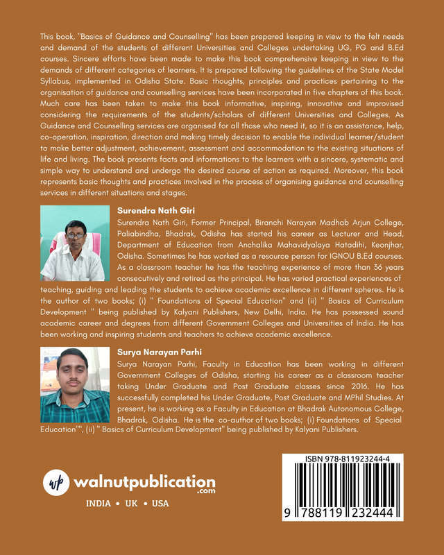 This book, “Basics of Guidance and Counselling” has been prepared keeping in view to the felt needs and demand of the students of different Universities and Colleges undertaking UG, PG and B.Ed. courses. Sincere efforts have been made to make this book comprehensive keeping in view to the demands of different categories of learners. The book presents facts and informations to the learners with a sincere, systematic and simple way to understand and undergo the desired course of action as required. Moreover, this book represents basic thoughts and practices involved in the process of organizing guidance and counselling services in different situations and stages.