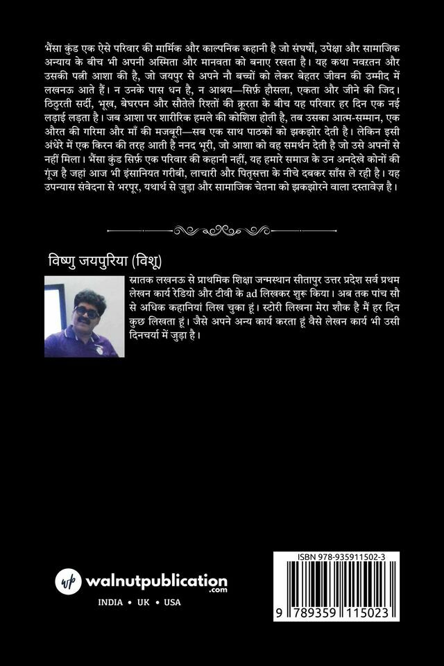 भैंसा कुंड एक ऐसे परिवार की मार्मिक और काल्पनिक कहानी है जो संघर्षों, उपेक्षा और सामाजिक अन्याय के बीच भी अपनी अस्मिता और मानवता को बनाए रखता है। यह कथा नवऱतन और उसकी पत्नी आशा की है, जो जयपुर से अपने नौ बच्चों को लेकर बेहतर जीवन की उम्मीद में लखनऊ आते हैं। न उनके पास धन है, न आश्रय—सिर्फ़ हौसला, एकता और जीने की जिद। ठिठुरती सर्दी, भूख, बेघरपन और सौतेले रिश्तों की क्रूरता के बीच यह परिवार हर दिन एक नई लड़ाई लड़ता है। जब आशा पर शारीरिक हमले की कोशिश होती है, तब उसका आत्म-सम्मान, एक औरत की गरिमा और माँ की मजबूरी—सब एक साथ पाठकों को झकझोर देती है। लेकिन इसी अंधेरे में एक किरन की तरह आती है ननद भूरी, जो आशा को वह समर्थन देती है जो उसे अपनों से नहीं मिला। भैंसा कुंड सिर्फ़ एक परिवार की कहानी नहीं, यह हमारे समाज के उन अनदेखे कोनों की गूंज है जहां आज भी इंसानियत गरीबी, लाचारी और पितृसत्ता के नीचे दबकर साँस ले रही है। यह उपन्यास संवेदना से भरपूर, यथार्थ से जुड़ा और सामाजिक चेतना को झकझोरने वाला दस्तावेज़ है।