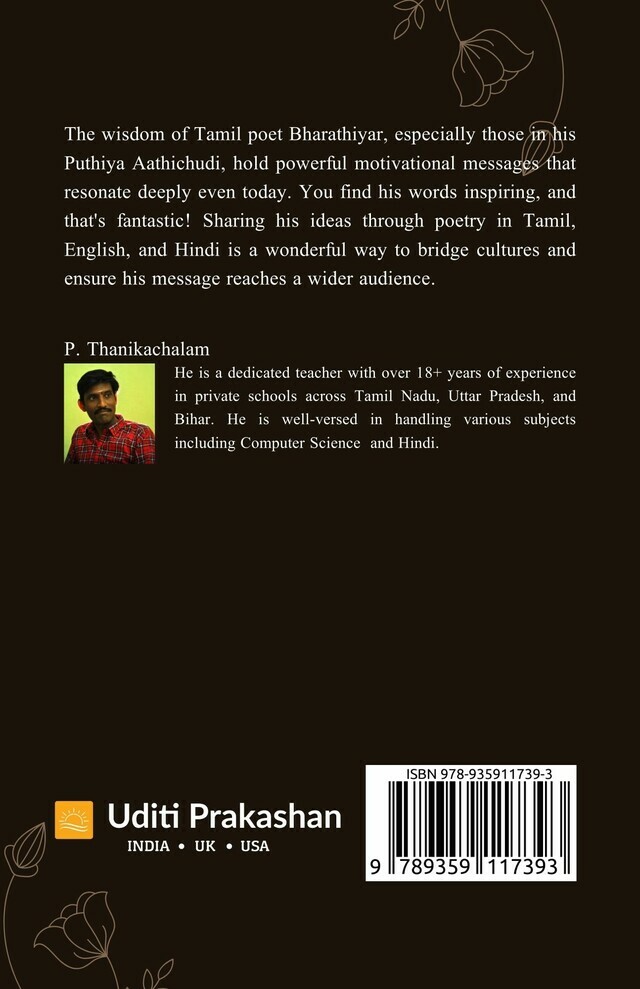 Bharathiyar’s poetry in his work *Puthiya Aathichudi* contains profound motivational messages that remain relevant today. His wisdom inspires people across cultures, and sharing his ideas through poetry in Tamil, English, and Hindi can bridge cultural gaps and extend his message to a broader audience.