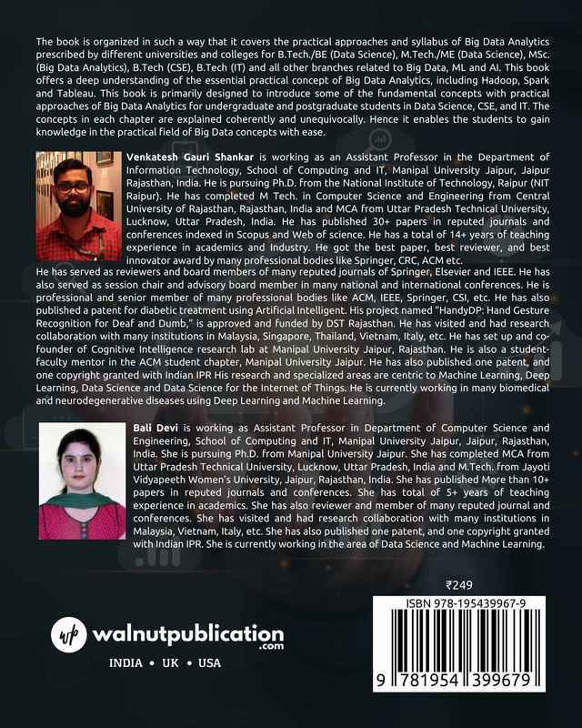 The book is organized in such a way that it covers the practical approaches and syllabus of Big Data Analytics prescribed by different universities and colleges for B.Tech./BE (Data Science), M.Tech./ME (Data Science), MSc. (Big Data Analytics), B.Tech (CSE), B.Tech (IT) and all other branches related to Big Data, ML and AI.