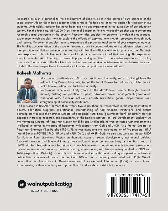 ‘Research’ as such is cardinal to the development of society. Be it in the arena of pure sciences or the social sector. Albeit, the Indian education system has so far failed to ignite the passion for research in our students. Undeniably, research has never been given its due importance in the curriculum of our education system. For the first time, NEP 2020 (New National Education Policy) holistically emphasizes a systematic research-based ecosystem in the country. Research also enables the students to widen the educational experience, which enables them to explore the effects of applying new thought processes through study and testing. Moreover, it enables them to experience the practical application of your classroom lectures. This book is documentation of the excellent research done by undergraduate and graduate students out of their practical on filed experience by interacting with frontline officials and senior policy makers. The first-hand exposure to the challenges in the social fabric was the key point of their learning. The experience taught them the skill of writing a research paper and gave them a memorable experience of policy advocacy. The purpose of this book is to share the divergent work of incisive research undertaken by young minds to the new perspectives of eminent social issues and policy recommendations.
