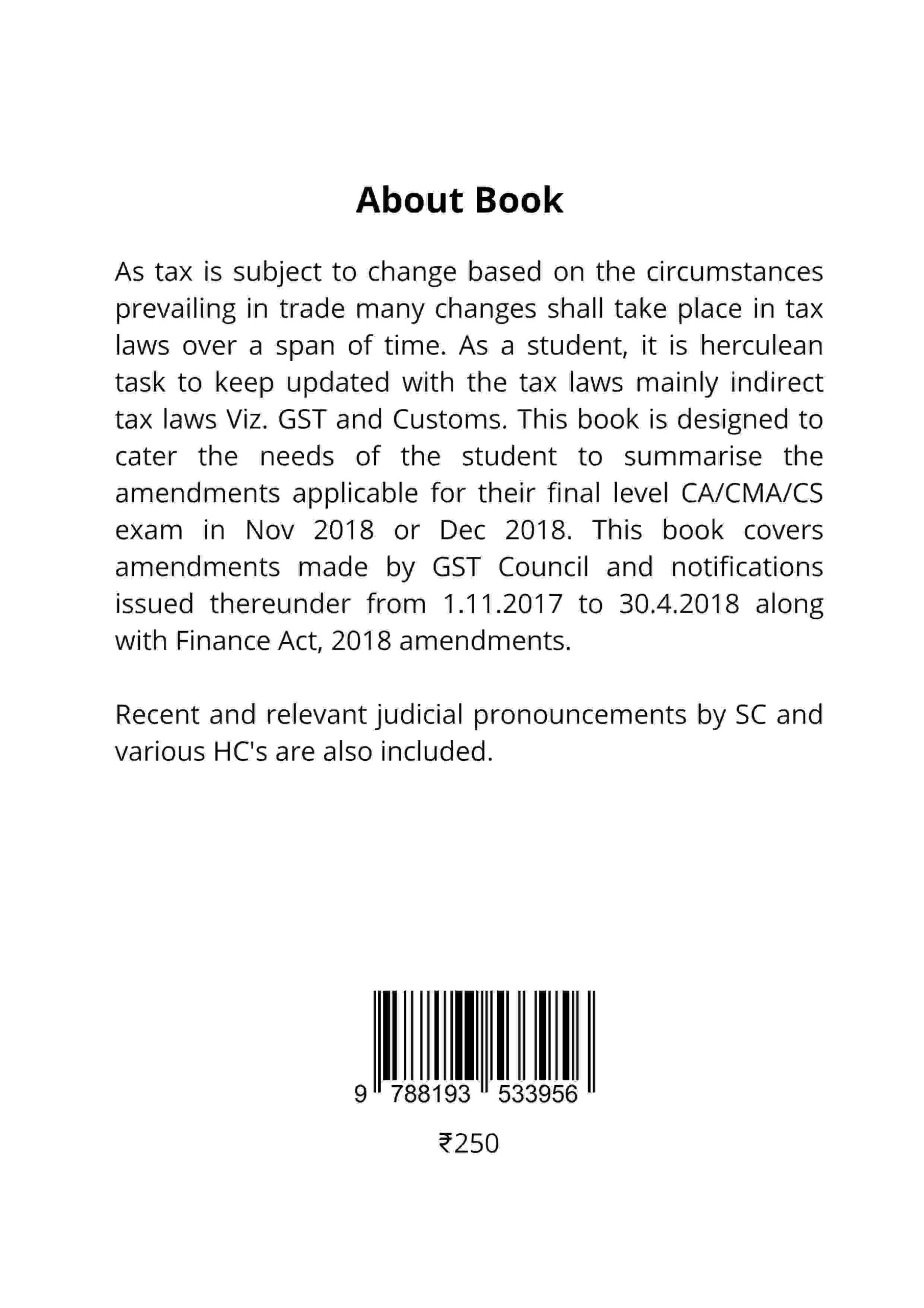 As tax is subject to change based on the circumstances prevailing in trade many changes shall take place in tax laws over a span of time. As a student, it is herculean task to keep updated with the tax laws mainly indirect tax laws Viz. GST and Customs. This book is designed to cater the needs of the student to summarise the amendments applicable for their final level CA/CMA/CS exam in Nov 2018 or Dec 2018. This book covers amendments made by GST Council and notifications issued thereunder from 1.11.2017 to 30.4.2018 along with Finance Act, 2018 amendments.