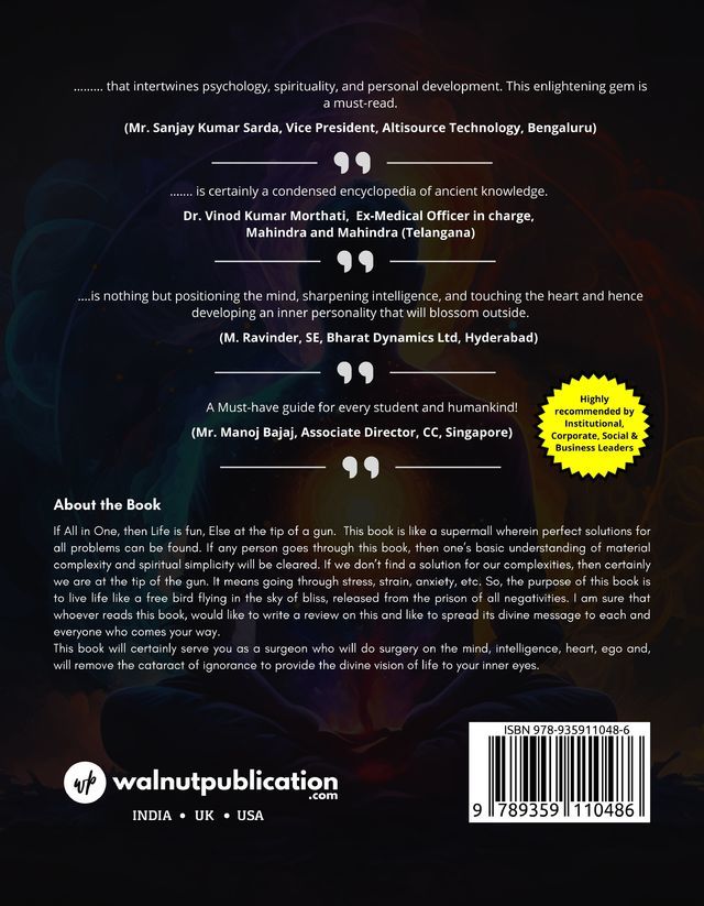 This book is like a supermall wherein perfect solutions for all problems can be found. If any person goes through this book, then one’s basic understanding of material complexity and spiritual simplicity will be cleared. It will certainly serve you as a surgeon who will do surgery on the mind, intelligence, heart, ego and, will remove the cataract of ignorance to provide the divine vision of life to your inner eyes.