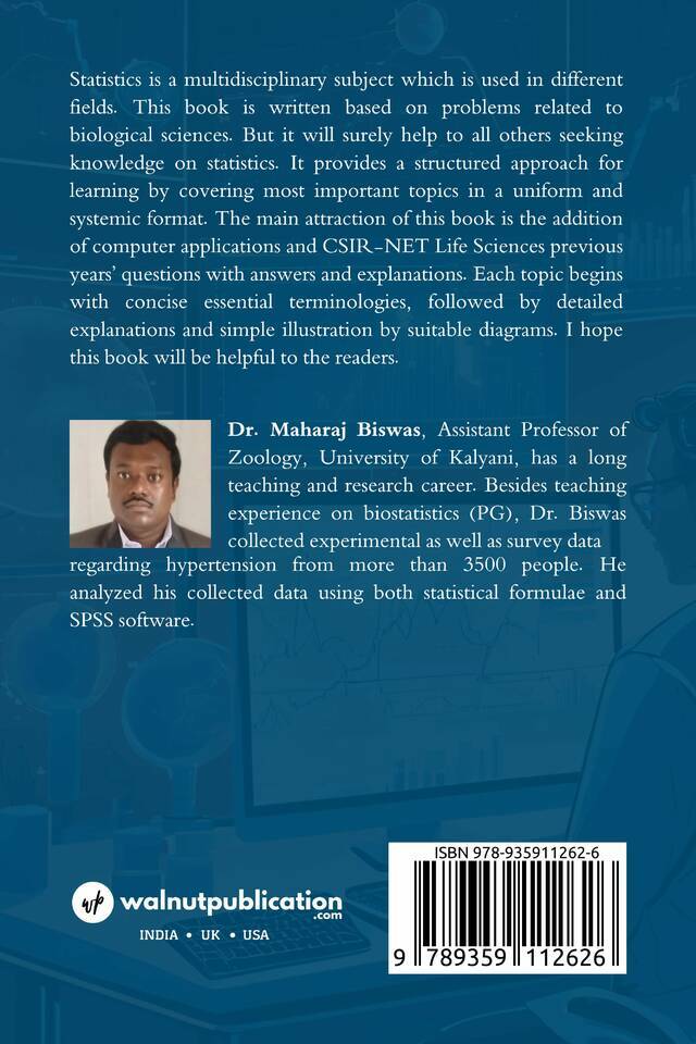 This book on statistics, primarily aimed at the biological sciences, serves as a valuable resource for anyone looking to enhance their statistical knowledge. It presents essential topics in a systematic manner and includes computer applications along with past CSIR-NET Life Sciences questions, complete with answers and explanations. Each section starts with key terminologies, followed by detailed discussions and clear diagrams, making it an informative and structured learning tool.