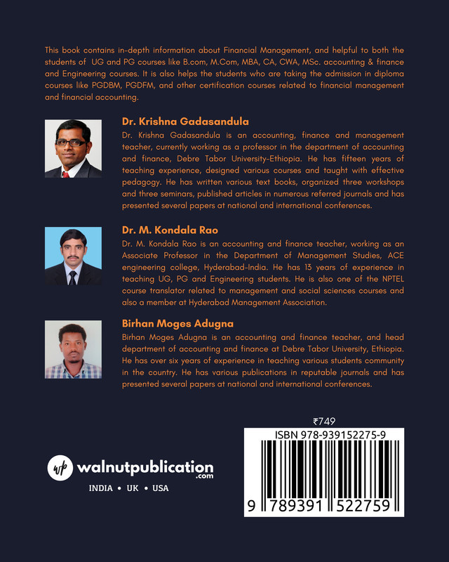 This book contains in-depth information about Financial Management, and helpful to both the students of UG and PG courses like B.com, M.Com, MBA, CA, CWA, MSc. accounting & finance and Engineering courses.