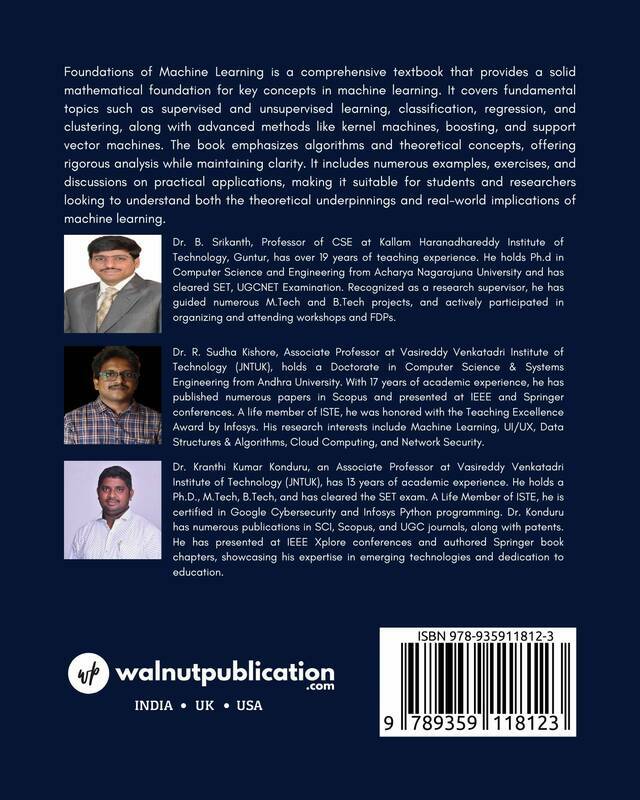 “Foundations of Machine Learning” is a thorough textbook that establishes a strong mathematical base for essential machine learning concepts. It addresses core topics like supervised and unsupervised learning, classification, regression, and clustering, advancing to complex methods such as kernel machines and boosting. With a focus on algorithms and theory, it provides clear analysis, numerous examples, exercises, and discussions on practical applications, making it ideal for students and researchers alike in their pursuit of understanding machine learning.