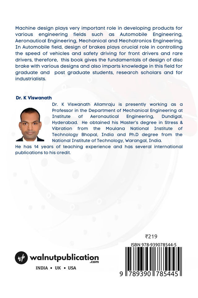 Machine design plays very important role in developing products for various engineering fields such as Automobile Engineering, Aeronautical Engineering, Mechanical and Mechatronics Engineering. In Automobile field, design of brakes plays crucial role in controlling the speed of vehicles and safety driving for front drivers and rare drivers, therefore, this book gives the fundamentals of design of disc brake with various designs and also imparts knowledge in this field for graduate and post graduate students, research scholars and for industrialists.