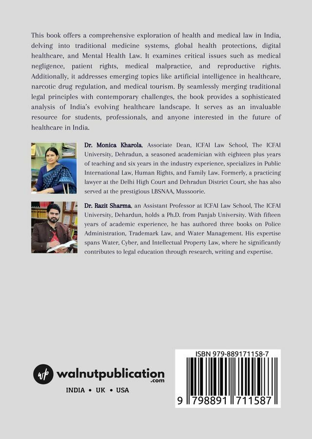 This book provides an extensive exploration of health and medical law in India, encompassing traditional medicine systems, global health protections, digital healthcare, and mental health law. It investigates critical issues such as medical negligence, patient rights, medical malpractice, and reproductive rights.