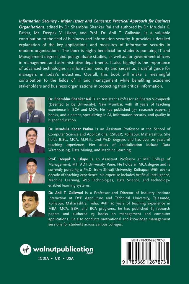 Information Security – Major Issues and Concerns: Practical Approach for Business Organisations, edited by Dr. Shambhu Shankar Rai and authored by Dr. Mrudula K. Patkar, Mr. Deepak V. Ulape, and Prof. Dr. Anil T. Gaikwad, is a valuable contribution to the field of business and information security. It provides a detailed explanation of the key applications and measures of information security in modern organizations. The book is highly beneficial for students pursuing IT and Management degrees and postgraduate studies, as well as for government officers in management and administrative departments.