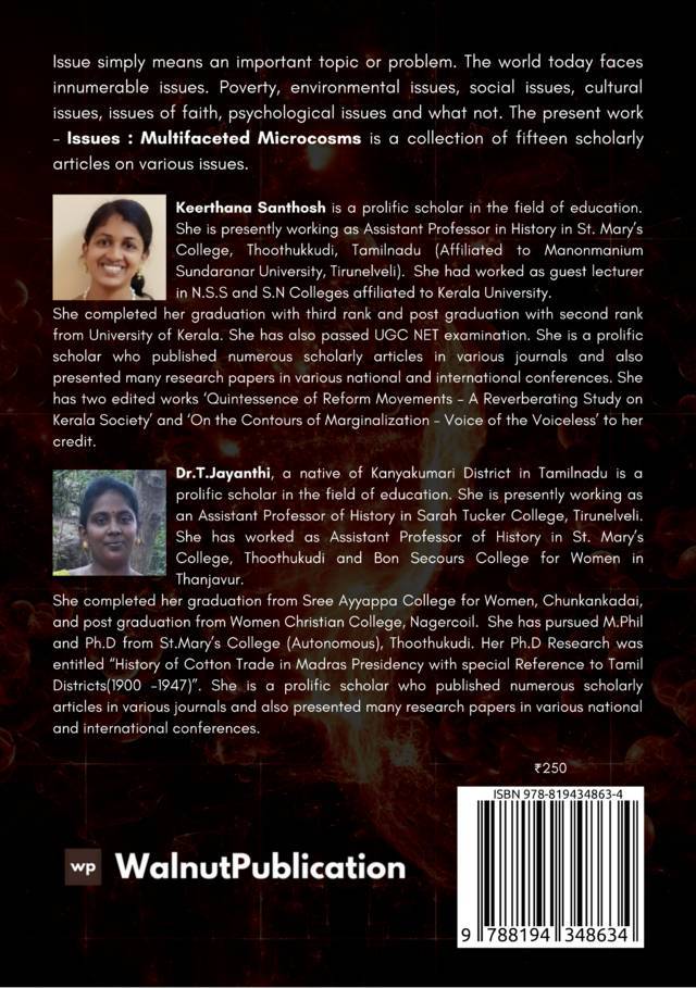 Issue simply means an important topic or problem. The world today faces innumerable issues. Poverty, environmental issues, social issues, cultural issues, issues of faith, psychological issues and what not. The present work – Issues : Multifaceted Microcosms is a collection of fifteen scholarly articles on various issues.