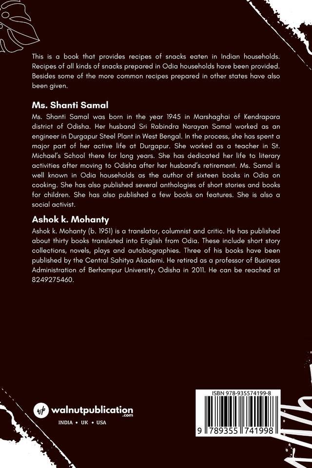 This is a book that provides recipes of snacks eaten in Indian households. Recipes of all kinds of snacks prepared in Odia households have been provided. Besides some of the more common recipes prepared in other states have also been given.