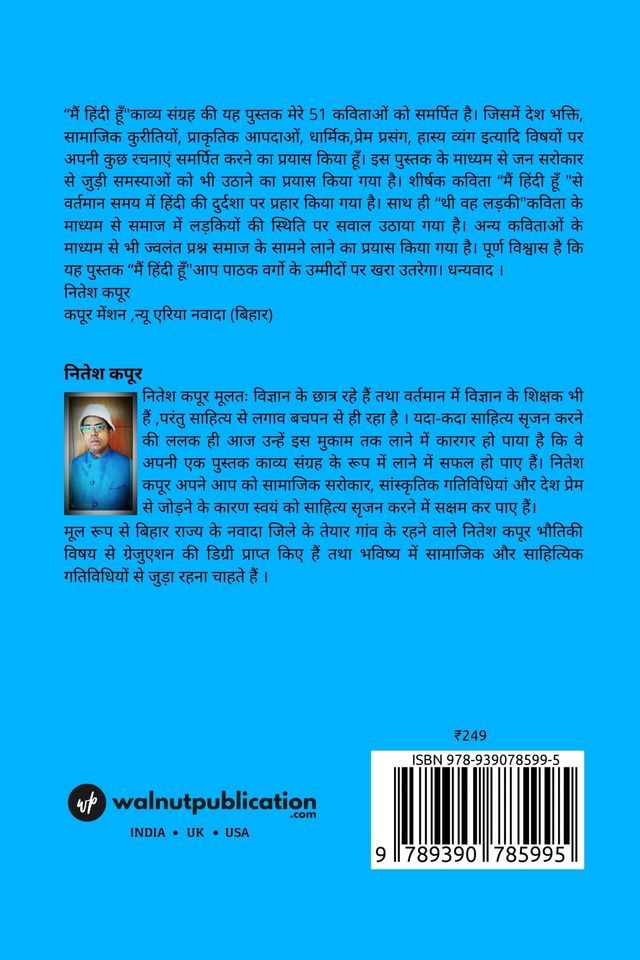 The book “Main Hindi Hun” is a collection of poetries dedicated to my 51 poems. In which I have tried to dedicate some of my compositions on subjects of patriotism, social evils, natural calamities, religious issues, love affairs, humor satire etc.