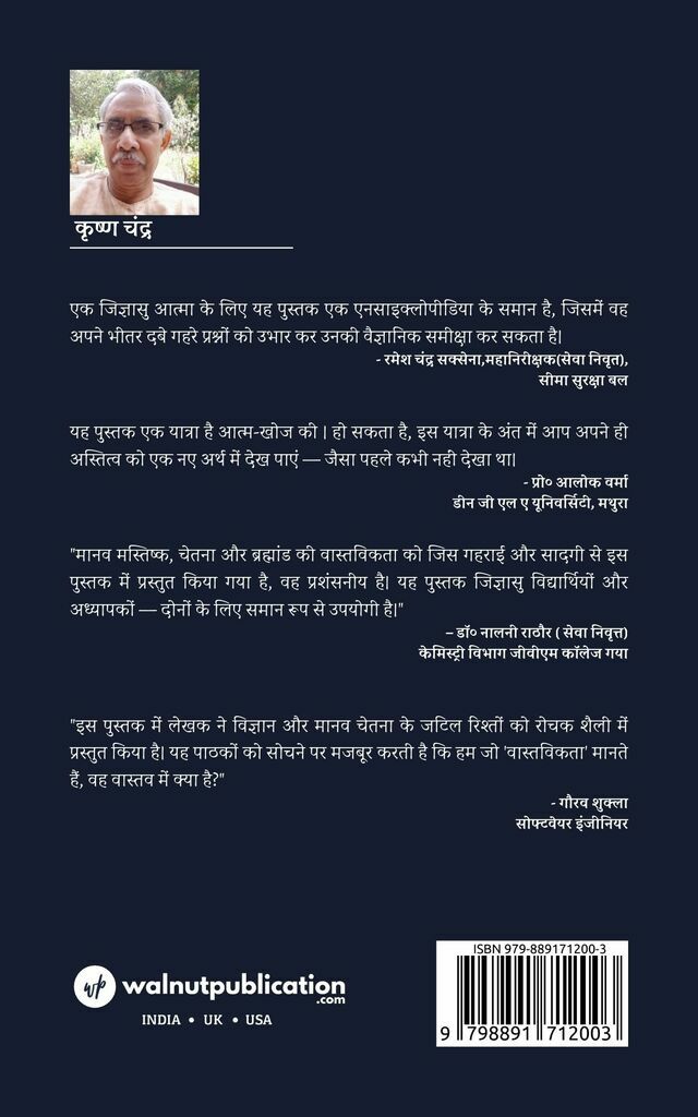 This book unveils the profound mysteries of human consciousness, time, space, and the universe through the lens of neurology, psychology, modern science, and philosophy—all conveyed in lucid, accessible language. It explores the hidden fear of death, the potential scientific dimensions of divinity, the deep-rooted grip of myths and belief systems, and the boundless states of meditation and self-realization. Through thought-provoking dialogues between a curious yogini and a truth-seeking scientist, the narrative touches upon the primordial essence of religion and philosophy as experienced in everyday human life.