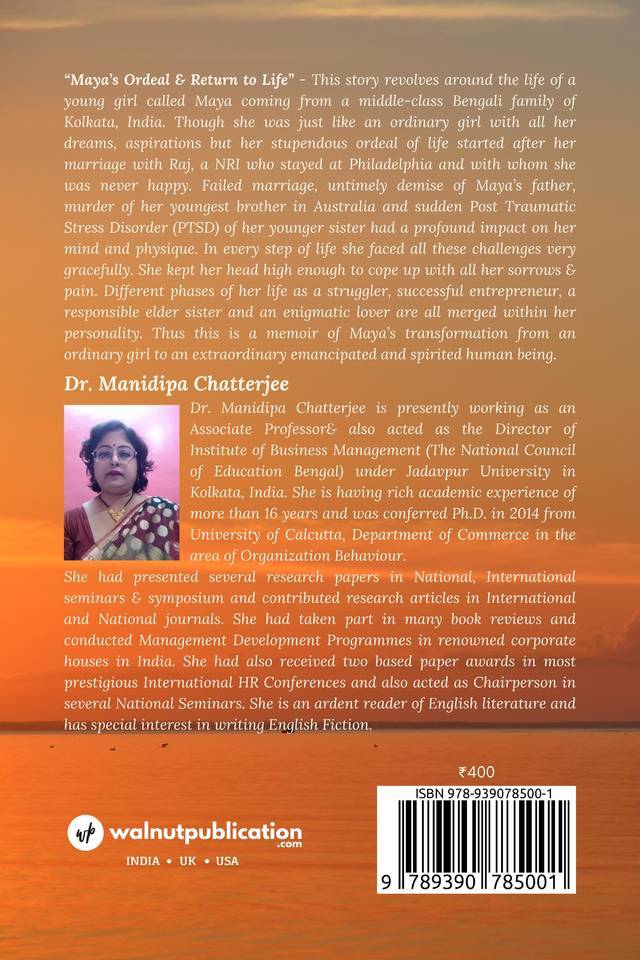 “Maya’s Ordeal & Return to Life” – This story revolves around the life of a young girl called Maya coming from a middle-class Bengali family of Kolkata, India. Though she was just like an ordinary girl with all her dreams, aspirations but her stupendous ordeal of life started after her marriage with Raj, a NRI who stayed at Philadelphia and with whom she was never happy. Failed marriage, untimely demise of Maya’s father, murder of her youngest brother in Australia and sudden Post Traumatic Stress Disorder (PTSD) of her younger sister had a profound impact on her mind and physique. In every step of life she faced all these challenges very gracefully. She kept her head high enough to cope up with all her sorrows & pain. Different phases of her life as a struggler, successful entrepreneur, a responsible elder sister and an enigmatic lover are all merged within her personality. Thus this is a memoir of Maya’s transformation from an ordinary girl to an extraordinary emancipated and spirited human being.