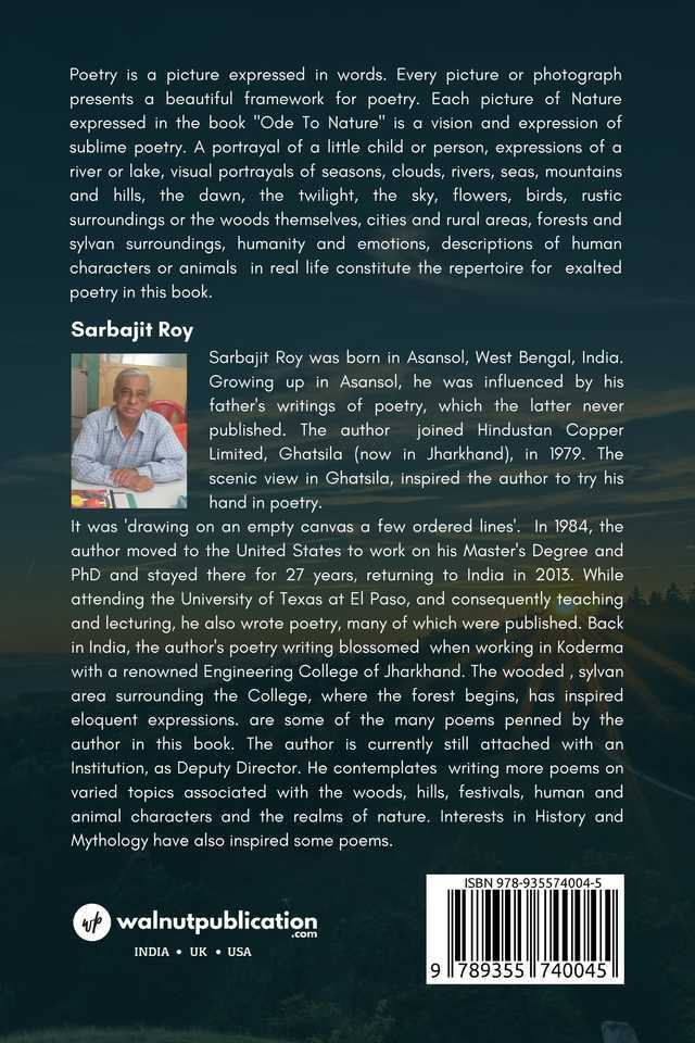 Poetry is a picture expressed in words. Every picture or photograph presents a beautiful framework for poetry. Each picture of Nature expressed in the book “Ode To Nature” is a vision and expression of sublime poetry. A portrayal of a little child or person, expressions of a river or lake, visual portrayals of seasons, clouds, rivers, seas, mountains and hills, the dawn, the twilight, the sky, flowers, birds, rustic surroundings or the woods themselves, cities and rural areas, forests and sylvan surroundings, humanity and emotions, descriptions of human characters or animals in real life constitute the repertoire for exalted poetry in this book.