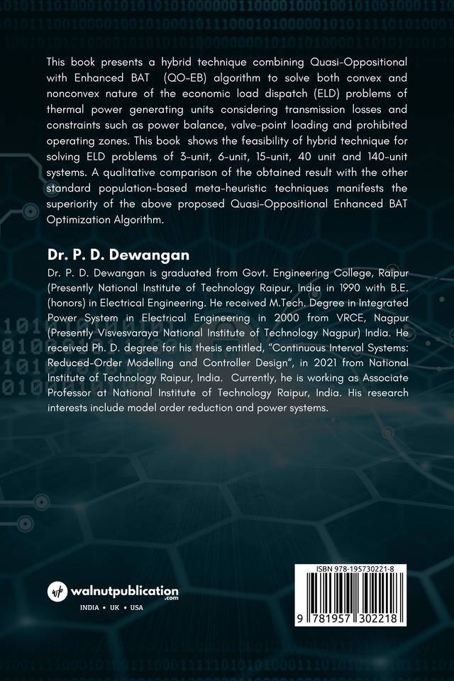 This book presents a hybrid technique combining Quasi-Oppositional with Enhanced BAT (QO-EB) algorithm to solve both convex and non-convex nature of the economic load dispatch (ELD) problems of thermal power generating units considering transmission losses and constraints such as power balance, valve-point loading and prohibited operating zones. This book shows the feasibility of hybrid technique for solving ELD problems of 3-unit, 6-unit, 15-unit, 40 unit and 140-unit systems. A qualitative comparison of the obtained result with the other standard population-based meta-heuristic techniques manifests the superiority of the above proposed Quasi-Oppositional Enhanced BAT Optimization Algorithm.