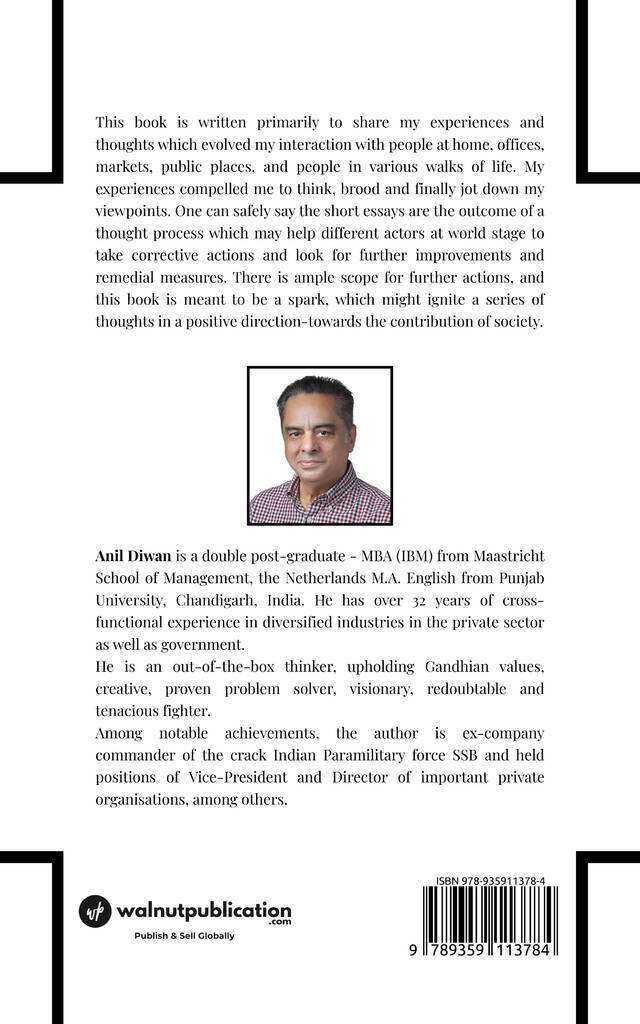 This book is written primarily to share my experiences and thoughts which evolved my interaction with people at home, offices, markets, public places, and people in various walks of life. My experiences compelled me to think, brood and finally jot down my viewpoints. One can safely say the short essays are the outcome of a thought process which may help different actors at world stage to take corrective actions and look for further improvements and remedial measures. There is ample scope for further actions, and this book is meant to be a spark, which might ignite a series of thoughts in a positive direction-towards the contribution of society.