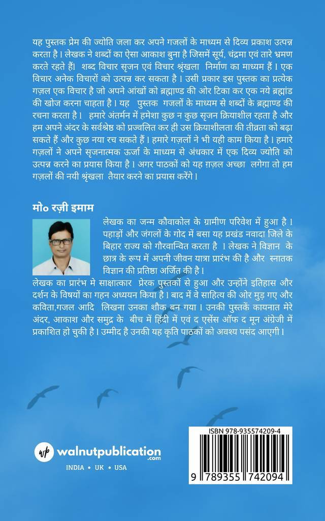 This book generates divine light through its ghazals by lighting the flame of love. The author has woven such a sky of words in which the sun, moon and stars keep moving. Words are the means of thought creation and thought chain formation. One thought can generate many ideas. Similarly, each ghazal in this book is a thought which seeks to discover a new universe by keeping its eyes fixed on the universe. The book creates the universe of words through ghazals. There is always some creation active in our inner self and only by igniting the best within us we can increase the intensity of that activity and create something new. Our Ghazals have also done the same thing. Through energy, we have tried to create a divine light in the darkness. If readers like this ghazal, then we will try to prepare a new series of ghazals.