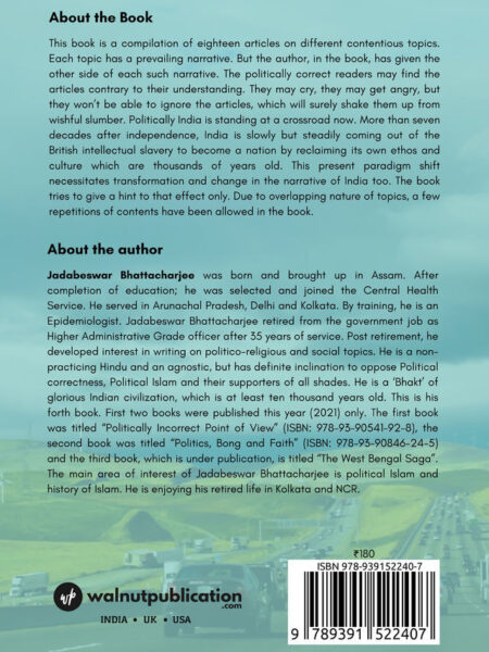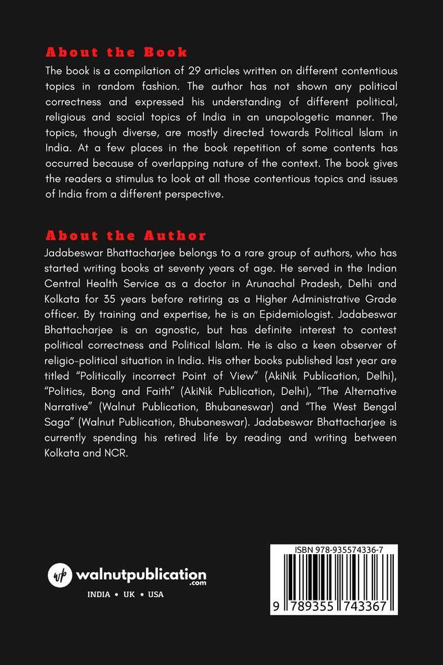 The book is a compilation of 29 articles written on different contentious topics in random fashion. The author has not shown any political correctness and expressed his understanding of different political, religious and social topics of India in an unapologetic manner. The topics, though diverse, are mostly directed towards Political Islam in India. At a few places in the book repetition of some contents has occurred because of overlapping nature of the context. The book gives the readers a stimulus to look at all those contentious topics and issues of India from a different perspective.