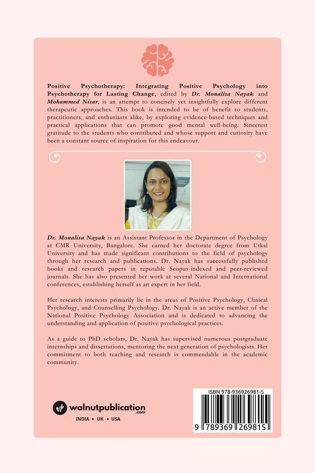 Positive Psychotherapy: Integrating Positive Psychology into Psychotherapy for Lasting Change, edited by Dr. Monalisa Nayak and Mohammed Nisar, is an attempt to concisely yet insightfully explore different therapeutic approaches. This book is intended to be of benefit to students, practitioners, and enthusiasts alike, by exploring evidence-based techniques and practical applications that can promote good mental well-being. Sincerest gratitude to the students who contributed and whose support and curiosity have been a constant source of inspiration for this endeavour.