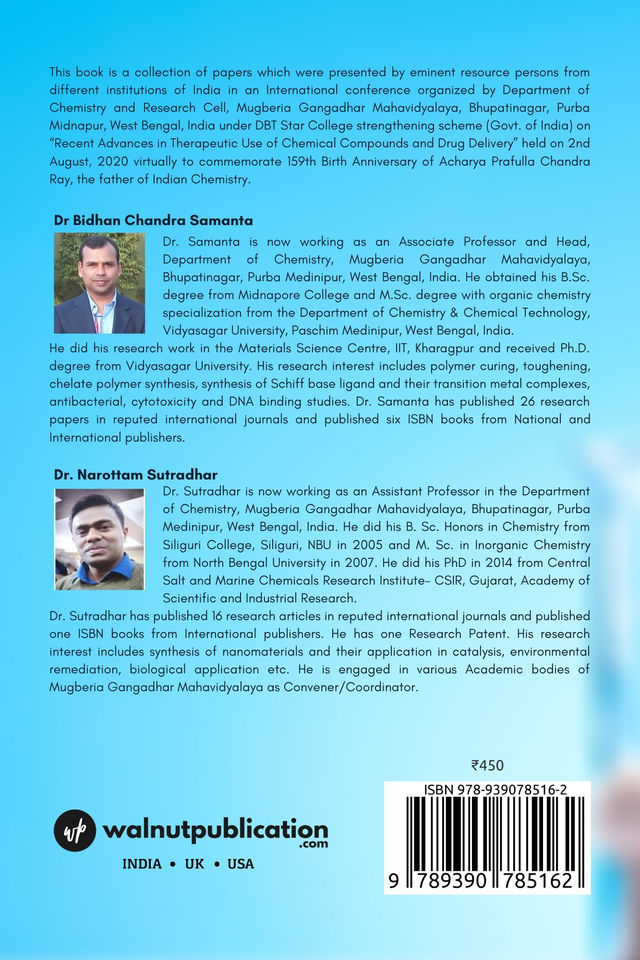 This book is a collection of papers which were presented by eminent resource persons from different institutions of India in an International conference organized by Department of Chemistry and Research Cell, Mugberia Gangadhar Mahavidyalaya, Bhupatinagar, Purba Midnapur, West Bengal, India under DBT Star College strengthening scheme (Govt. of India) on “Recent Advances in Therapeutic Use of Chemical Compounds and Drug Delivery” held on 2nd August, 2020 virtually to commemorate 159th Birth Anniversary of Acharya Prafulla Chandra Ray, the father of Indian Chemistry.