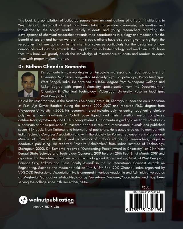 This book is a compilation of collected papers from eminent authors of different institutions in West Bengal. This small attempt has been taken to provide awareness, information and knowledge to the target readers mainly students and young researchers regarding the development of chemical researches towards their contributions in biology and medicine for the benefit of society and human welfare. In this book, efforts have also been given to highlight the researches that are going on in the chemical sciences particularly for the designing of new compounds and devices towards their applications in biotechnology and medicine. I do hope that, this book will greatly enrich the knowledge of researchers, students and readers to equip them with proper implementation.
