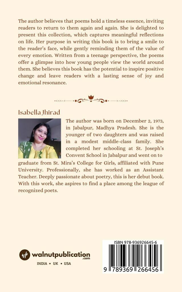 The author believes that poems hold a timeless essence, inviting readers to return to them again and again. She is delighted to present this collection, which captures meaningful reflections on life. Her purpose in writing this book is to bring a smile to the reader’s face, while gently reminding them of the value of every emotion.