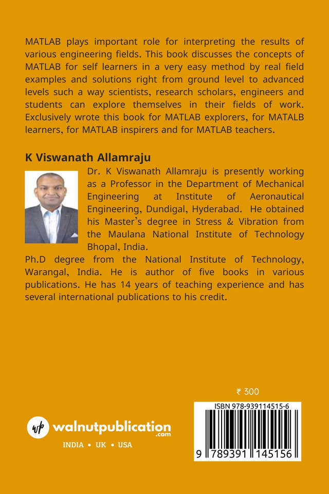 MATLAB plays important role for interpreting the results of various engineering fields. This book discusses the concepts of MATLAB for self learners in a very easy method by real field examples and solutions right from ground level to advanced levels such a way scientists, research scholars, engineers and students can explore themselves in their fields of work.