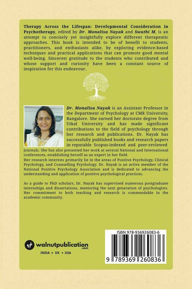 Therapy Across the Lifespan: Developmental Consideration in Psychotherapy, edited by Dr. Monalisa Nayak and Swathi M, is an attempt to concisely yet insightfully explore different therapeutic approaches. This book is intended to be of benefit to students, practitioners, and enthusiasts alike, by exploring evidence-based techniques and practical applications that can promote good mental well-being. Sincerest gratitude to the students who contributed and whose support and curiosity have been a constant source of inspiration for this endeavour.