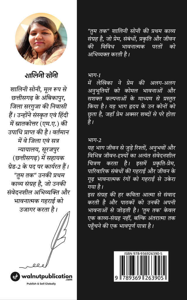 “Tum Tak” is the debut poetry collection by Shalini Soni, beautifully capturing the delicate layers of love, relationships, nature, and life’s emotional nuances. In Part 1, the poet explores various shades of love through tender emotions and vivid imagination, touching the silent corners of the heart where words often fall short. Part 2 delves into life’s experiences, deep familial bonds, and a soulful connection with nature. Each poem speaks to the reader’s inner self, evoking personal reflections. “Tum Tak” is not just a poetry collection it is an emotional journey that gently reaches the core of the soul.