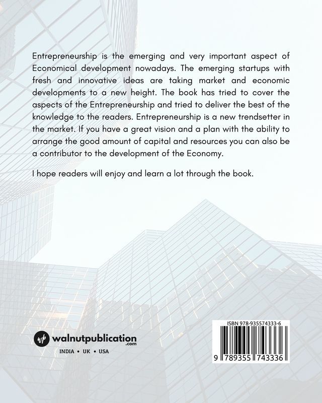 Entrepreneurship is the emerging and very important aspect of Economical development nowadays. The emerging startups with fresh and innovative ideas are taking market and economic developments to a new height. The book has tried to cover the aspects of the Entrepreneurship and tried to deliver the best of the knowledge to the readers. Entrepreneurship is a new trendsetter in the market. If you have a great vision and a plan with the ability to arrange the good amount of capital and resources you can also be a contributor to the development of the Economy.