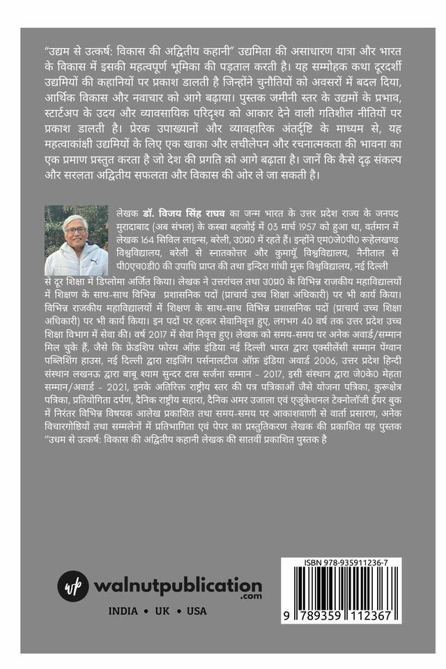 “उद्यम से उत्कर्ष: विकास की अद्वितीय कहानी” उद्यमिता की असाधारण यात्रा और भारत के विकास में इसकी महत्वपूर्ण भूमिका की पड़ताल करती है। यह सम्मोहक कथा दूरदर्शी उद्यमियों की कहानियों पर प्रकाश डालती है जिन्होंने चुनौतियों को अवसरों में बदल दिया, आर्थिक विकास और नवाचार को आगे बढ़ाया। पुस्तक जमीनी स्तर के उद्यमों के प्रभाव, स्टार्टअप के उदय और व्यावसायिक परिदृश्य को आकार देने वाली गतिशील नीतियों पर प्रकाश डालती है।