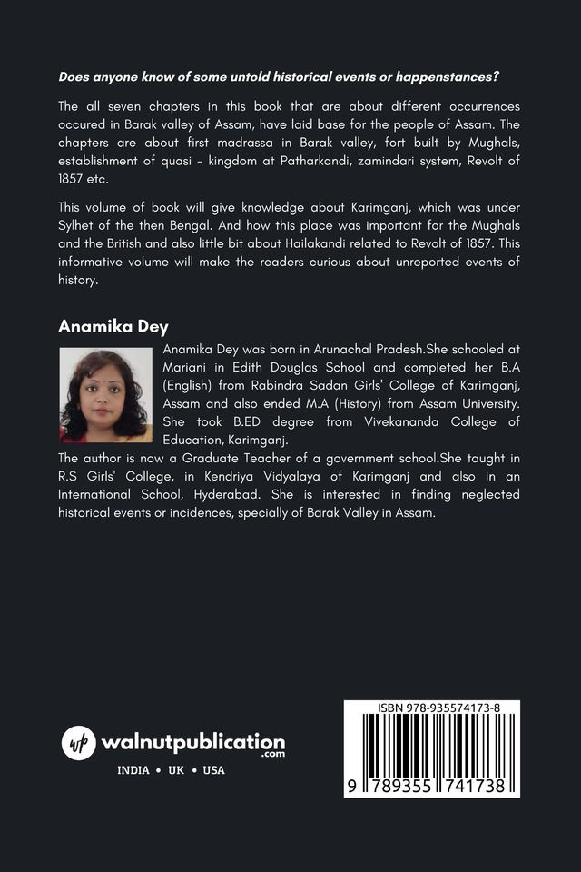 The all seven chapters in this book that are about different occurances occured in Barak valley of Assam, have laid base for the people of Assam. The chapters are about first madrassa in Barak valley, fort built by Mughals, establishment of quasi – kingdom at Patharkandi, zamindari system, Revolt of 1857 etc.