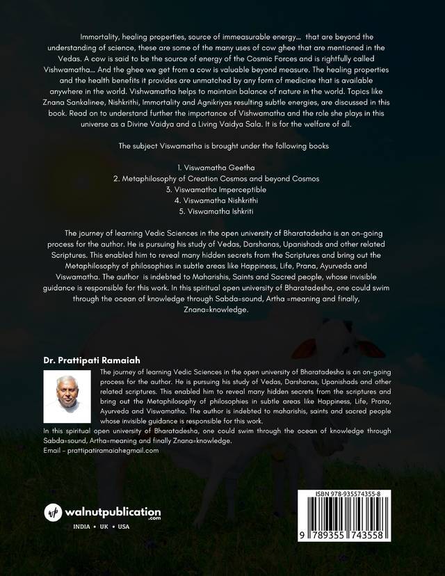 Immortality, healing properties, source of immeasurable energy… that are beyond the understanding of science, these are some of the many uses of cow ghee that are mentioned in the Vedas. A cow is said to be the source of energy of the Cosmic Forces and is rightfully called Vishwamatha and the ghee we get from a cow is valuable beyond measure. The healing properties and the health benefits it provides are unmatched by any form of medicine that is available anywhere in the world. Vishwamatha helps to maintain balance of nature in the world. Topics like Znana Sankalinee, Nishkrithi, Immortality and Agnikriyas resulting subtle energies, are discussed in this book. Read on to understand further the importance of Vishwamatha and the role she plays in this universe as a Divine Vaidya and a Living Vaidya Sala. It is for the welfare of all.
