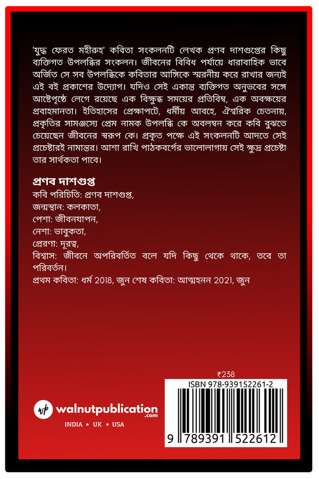 ‘Yuddho Ferot Moheeruho’ is the collection of some personal insights by the author Pranab Dasgupta. The purpose of publishing this book is to commemorate all the perceptions that have been continuously achieved at various stages of life in the form of poetry.